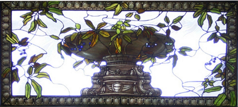 Cobb Front door This piece is the transom window for a front entry way. The completed project will include the two side lights on either side of the front door. The background glass is a highly textured wavy glass that picks up the movement in the vines and creates visual interest and depth. The detail in the urn and border was created with glass paint. This is an old word technique that is painted onto the individual pieces of glass and kiln fired before the window is assembled. The firing leaves a material that is as permanent and light fast as the glaze on your bathroom tile. |