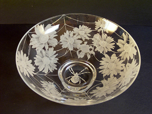 Spider in the Daisies 16” diameter glass bowl, $450 This bowl was inspired by the life in my garden. Imagine my surprise when I was dead heading daisies and I came across this lovely lady. Needless to say the daisies were allowed to go wild the rest of the year. The best part about this bowl is that you don't get to see our little friend until you are looking directly over the top. She can't be seen from the side of the bowl. |