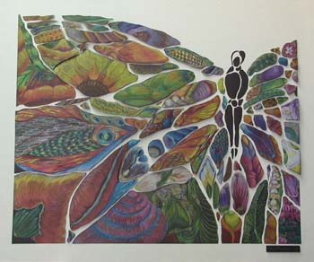 As I began to develop more fluidity in my cut paper pieces, I started to find the discarded shapes as intriguing as the original image. I set about creating images on each of the pieces that related in some way to its shape and the overall concept of the work. I then reassembled the pieces into their original relationships and was delighted by the results. There is a great deal of spontaneity in the image and their haphazard relationship to each other; however, they are still bound in a cohesive overall image. My sculpture background came into play when I began to break through the picture plain and raised the wing pieces up off the surface. This has achieved an element of movement by changing the levels and angles of the individual pieces. |