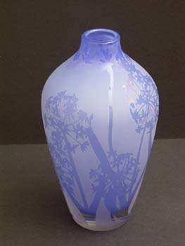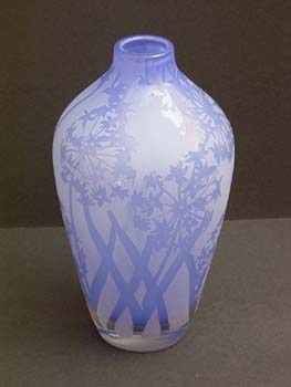 Alliums 9”; blue milk glass $275 This is an etched vase that was created in reverse of my original process. The alliums are left clear and the background is etched. I did this to highlight the color of the flowers. The clear flowers are somewhat transparent so that the flowers on the reverse side create movement and depth upon close inspection. The etched background also obscures the stems of cut flowers so that the alliums change color with the floral arrangement, but the rest of the vase stays true. |