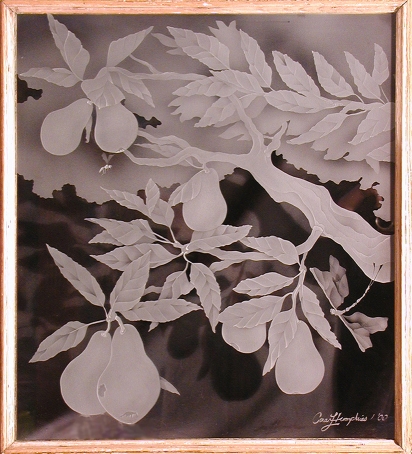 This piece was created to partially obscure the view into the home while still allowing a clear view of the person at the door. The top half of the window is more fully carved to obscure the view from the street and front walk. The bottom half of the view is blocked by the staircase wall. When a person enters the front porch they are easily seen by the occupants while the visitor must press their face to the lower half of the glass to get a excellent view of the large Labrador retriever standing there to greet them. |