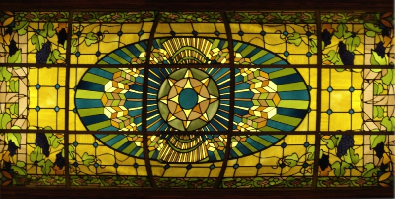 Laue Ceiling Dome This dome was created as a ceiling light over the bar in the client's basement tavern. In is one item in the multiphase project that included bathroom doors, a backlit bench surround, cabinet doors, and a carved, beveled, and stained glass wine cellar door. |