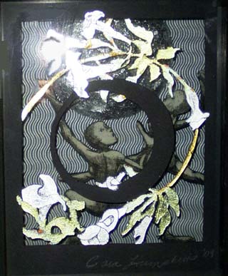 Moon Dance 8" x 10" Mixed media: cut paper, silver and gold leaf, intallio print, and styrofoam, $250.00 . | Moon dance is an exploration of obsession. The object is typically an attempt to replace a spritual void in our own being. We can become moths to our great need. So much that we sometimes ignore the beauty and grace of the world around us. Which is more tangible and life affirming than the object of our desire |